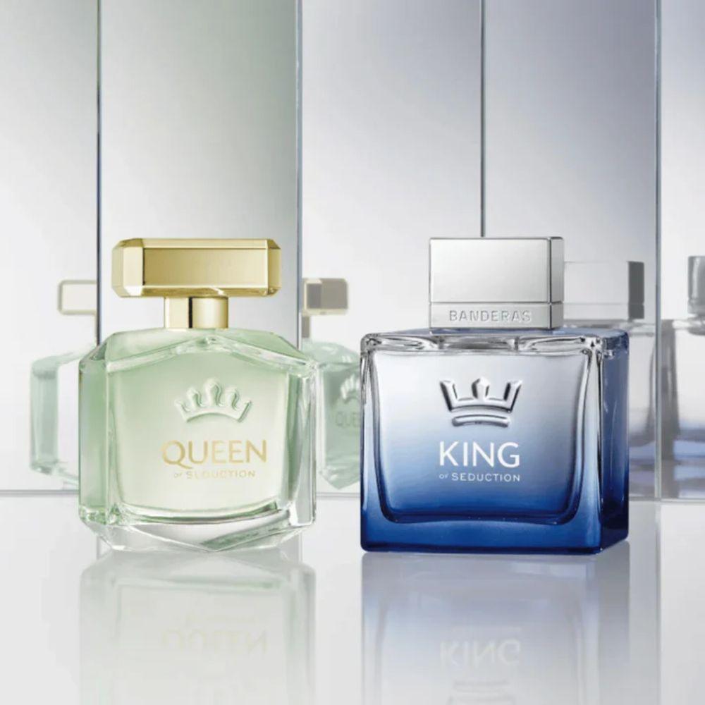Celebre um romance digno da realeza com o Kit Duo King + Queen of Seduction de Antonio Banderas. Um encontro elegante entre duas fragrâncias frescas e sedutoras, pensadas para casais que comandam sua própria história com charme e intensidade.