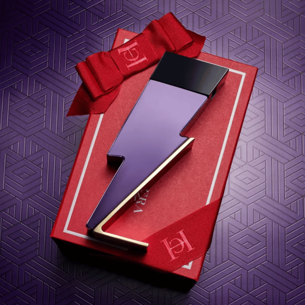 - Frasco: Um design moderno em formato de raio, com acabamento dourado cintilante que reflete o luxo e a sofisticação.