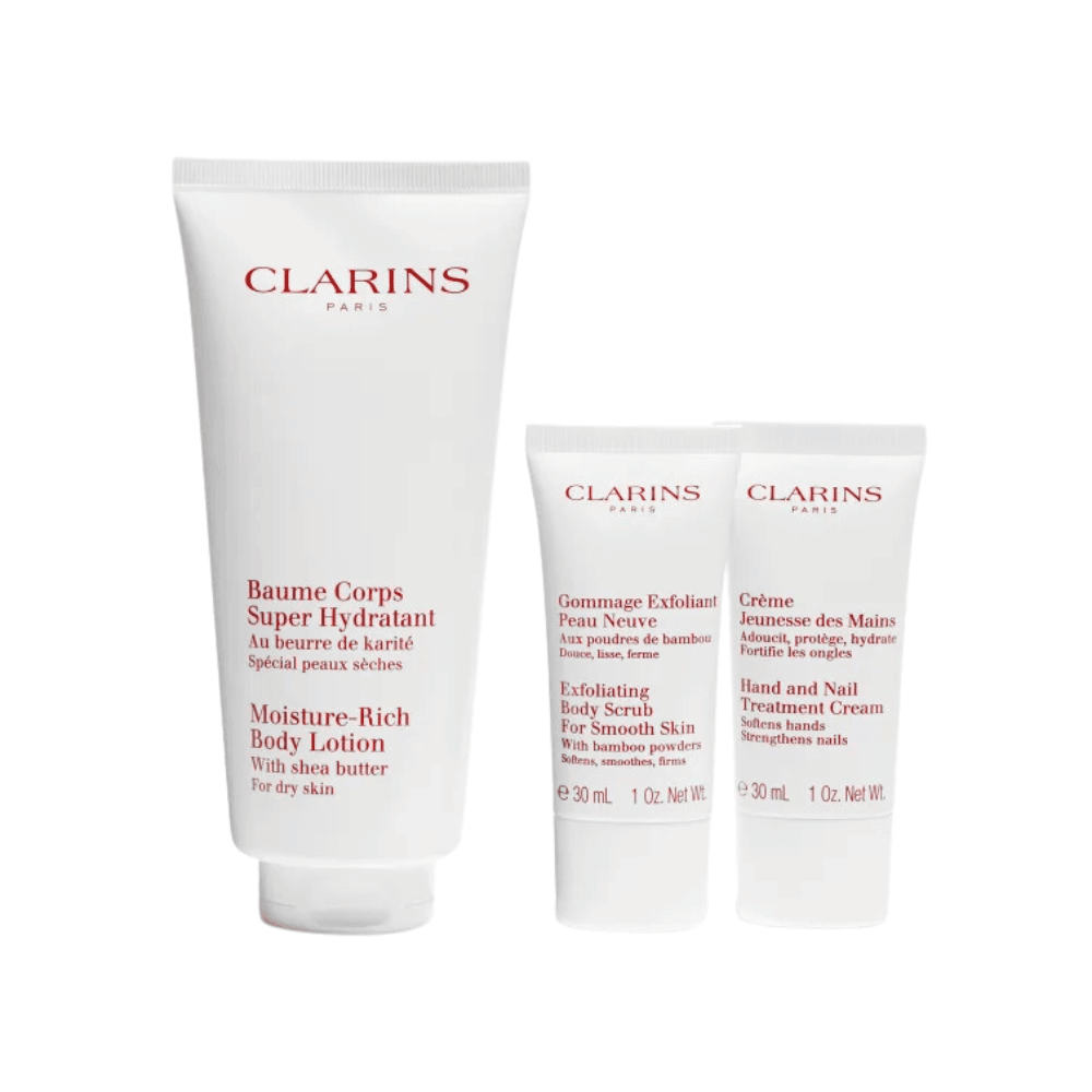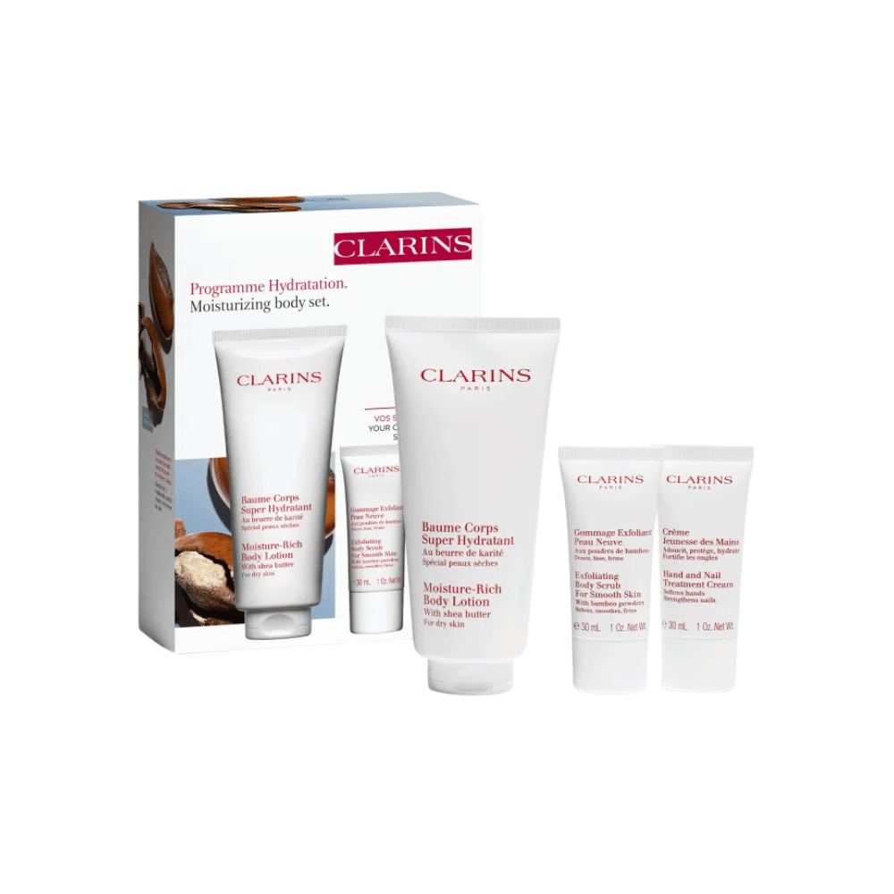 Desfrute de uma experiência luxuosa de cuidados com a pele com o Kit Clarins Hidratação Intensa Corporal Moisturizing Body Set. Este kit completo é especialmente formulado para proporcionar uma hidratação intensa, esfoliação suave e cuidado profundo para a pele do corpo e das mãos.