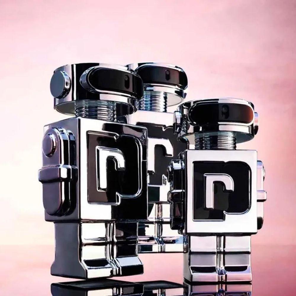 O frasco principal tem design inovador em forma de robô cromado, ícone de futurismo e tecnologia, enquanto o travel size oferece praticidade sem perder a identidade visual sofisticada da linha Phantom.