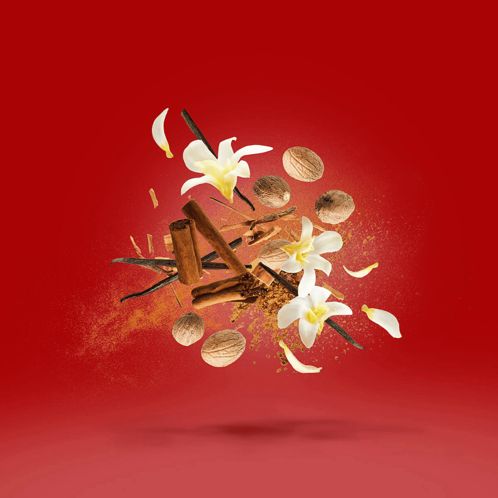 Notas de Topo: Noz-moscada e canela, uma combinação quente e especiada que abre a fragrância com um toque intrigante e sofisticado.